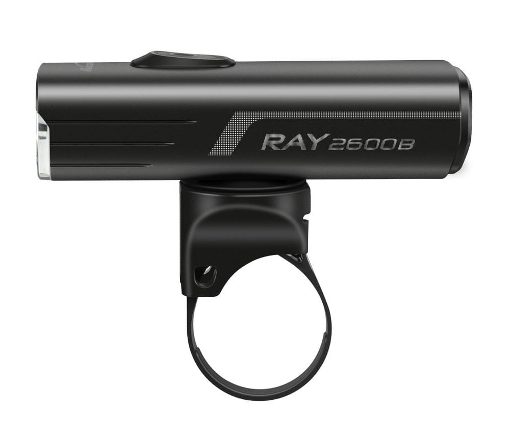 Nowa RAY 2600B to mocna lampka rowerowa z podwójną konfiguracją diod LED, zapewniającą wystarczającą ilość światła o mocy 2600 lumenów, odpowiednia do jazdy na rowerze górskim, przez szlaki, jazdy na rowerze szosowym i codziennych dojazdów do pracy.
