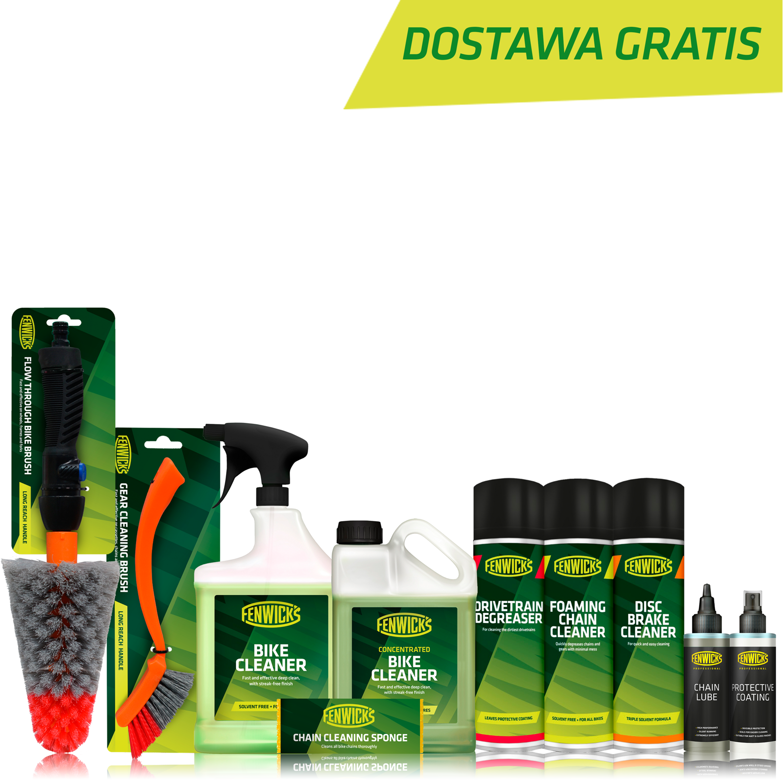 Zestaw tworzą preparaty niezbędne do kompleksowej pielęgnacji ukochanych jednośladów. Jest szczególnie przydatny dla przeciwników stosowania myjek wysoko-ciśnieniowych - w zestawie Przepływowa szczotka do czyszczenia roweru. Dzięki Fenwick's Amore Exclusive wyczyścisz nawet najbrudniejsze napędy rowerowe wykorzystując dostępny w zestawie Odtłuszczacz do napędu. Pozostałe preparaty pozwolą Ci zadbać o hamulce tarczowe, o powierzchnię ramy rowerowej z możliwością jej zabezpieczenia, sprowadzając kolejne mycie do banalnie prostego. Znajdujący się w zestawie Rowerowy koncentrat czyszczący dostarczy dodatkowych 11-tu litrów Płynu do czyszczenia roweru, natomiast Profesjonalny smar do łańcucha przyczyni się do cichych i dłuższych wypraw rowerowych. Darmowa dostawa to kolejna opcja, zachęcająca z pewnością do wyboru tego właśnie zestawu.