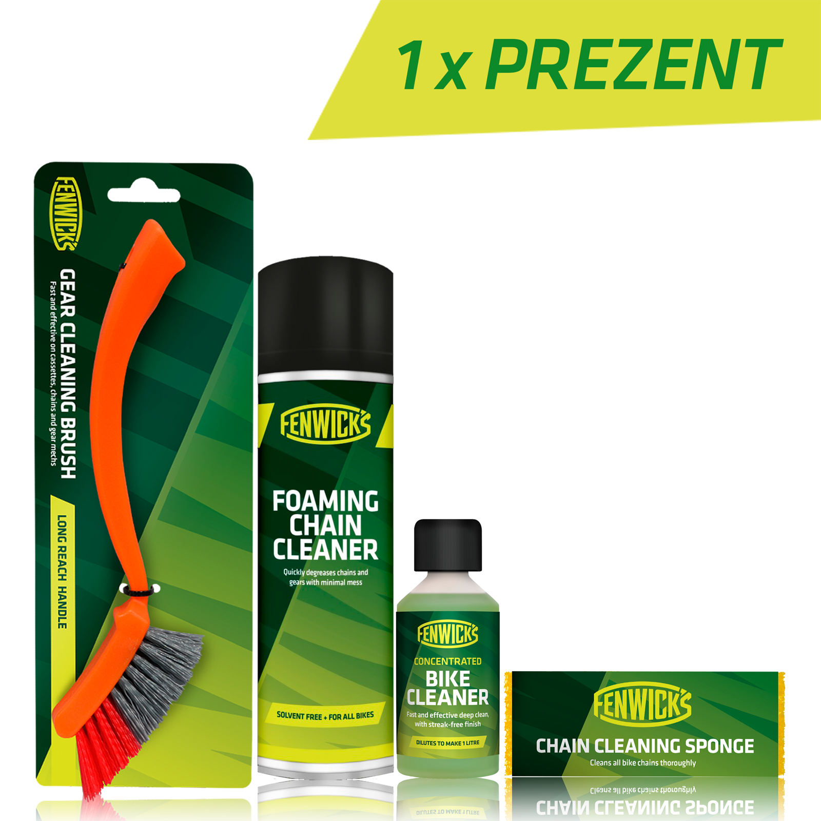 Zestaw tworzą preparaty Fenwick's niezbędne do wyczyszczenia napędu rowerowego, przy użyciu metody Rowerowego SPA Fenwick's. Zestaw szczególnie przydatny dla osób czyszczących napędy smarowane uprzednio profesjonalnym smarem Fenwick's, biodegradowalnymi olejami Fenwick's, również „lekkimi” olejami konkurencyjnych marek, wolnych jednak od ceramiki. Wybierając ten zestaw, otrzymujesz łącznie 4 produkty, z przyznawaną w gratisie próbką Rowerowego koncentratu czyszczącego 95ml. Po jej rozcieńczeniu w 1 litrze wody uzyskujemy Płyn do czyszczenia roweru. Z dotychczasowych doświadczeń wynika, że osoby, które przetestowały koncentrat, powracały do nas po jego 1 litrową wersję, owocującą 11 litrami Płynu czyszczącego.